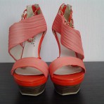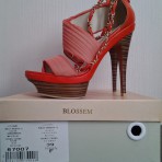 Красивые яркие босоножки Blossem. Красивого морковно-оранжевого цвета. Материал кожзам комбинированный с тканью, декорированы металлическими цепочками золотистого цвета. Высота каблука 14 см, высота платформы 4 см. Размер 39. Новые, в коробке, в комплекте есть запасные набойки. На ножке смотрятся просто сногсшибательно.