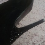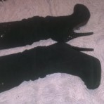 Сапоги из натуральной замши черного цвета, размер 35. По стельке 22 с. Каблук и верхняя часть голени в камнях. Каблук 12,5 см, танкетка 2,5 см,, обхват голени 35,5 см. Высота голени начиная от каблука 35 см.