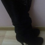 Сапоги из натуральной замши черного цвета, размер 35. По стельке 22 с. Каблук и верхняя часть голени в камнях. Каблук 12,5 см, танкетка 2,5 см,, обхват голени 35,5 см. Высота голени начиная от каблука...
