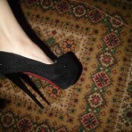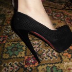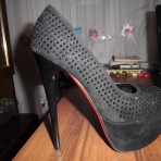 Замшевые туфли в камнях(лабутены).Каблук 16см,танкетка 5см.38р. может пойти и на 39р.В некоторых местах камушки отвалились,но это не заметно,чёрный насыщенный замш сливается с чёрными камнями и этого ...