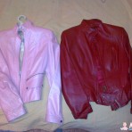 жакеты кожа розовая с перламутром,шелковый белый подклад, и красная, стильно по талии - под джинсы и не только женственно каждая по 200 грн на девушку с бюстом 2-3 размер 44-46 размер наш, 12 английский