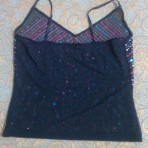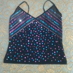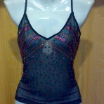 Маечка из сетки черного цвета. Перед весь украшен стразами. Красиво смотрится. Размер – 44-46. Состояние хорошее. Цена – 25 грн.