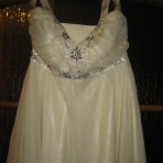 Светло-молочного цвета из дорогого стрейч-атласа, сверху юбка из натурального шифона, низ оторочен руликом из атласа.