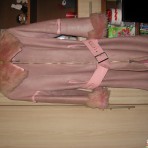 Фото 6: розовая натуральная очень теплая дубленка с большим воротником, есть потертости, длина рукава регулируется подворотом манжета, прикрывает колени при росте 174 см
