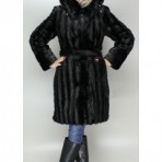 Шикарная шуба из эко-меха под норку с капюшоном и поясом, подчеркивающим талию. Капюшон не отстегивается. По бокам маленькие разрезы.