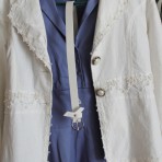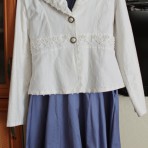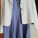 Повседневное платье василькового цвета станет нарядным благодаря белому пиджаку с жемчужной и кружевной отделкой. Пиджак тянется, поблёскивает на солнце. Для завершения образа - белый поясок в подарок...