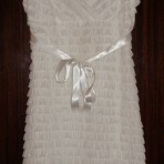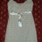Цвет молочный или «слоновой кости» из непрозрачной стрейч-основы и полупрозрачных стрейч-рюшиков каскадом (по типу закрытых жалюзей) с ленточкой, завязывающейся под грудью на бантик.