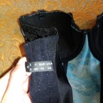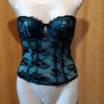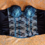 Черный с голубым кружевной корсет на косточках. Перед из сеточки не стрейча и кружева, спинка из растягивающейся черной ткани. На спинке 2 ряда крючков. Пороллоновая чашка. Размер чашки 2, есть карманы для подушек пуш-апа. Есть петельки для шлеек вверху и внизу для чулков. Размер 46. На последнем фото размеры, которые указаны на этикетке. Состояние хорошее. Цена – 40 грн.