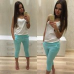 Женский летний яркий костюм: бриджи и блуза-топ.
