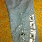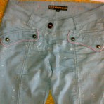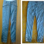 Узкие брюки со льна – стрейча. Украшены рисунками серого цвета. низ на кнопках. Впереди на ножках – шнурок – регулирующий стянутость штанины. Размер 44. (Размер, указан на брюках – 26). Половина ширины пояса – 42 см. Длина брюк по боковому шву – 97 см. состояние хорошее. Цена – 35 грн.