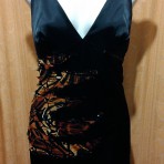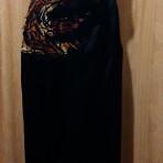 Вечернее длинное атласное платье. Атлас-стрейч. Платье черного цвета с вставкой тигриного принта. С открытой спинкой. Скрытая молния по боковому шву. Шлица впереди. Пошив прямой. По бедру – 46 см, в талии – 34 см. Состояние нового. Размер 44. Цена – 70 грн.