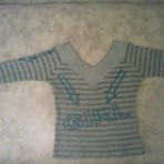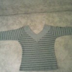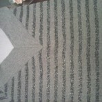 Женский свитерок, серого цвета в полоску (полоска серебристая из люрекса), размер: М, с надписью на спине.