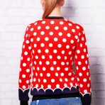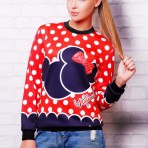 Красочный женский свитшот из дайвинга. Кофта красного цвета в крупный белый горох декорирована большим ярким принтом с изображением узнаваемых силуетов четы Маус. Резинки на поясе, манжетах и вороте выполнены в черном цвете.