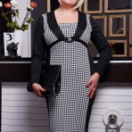 Платье женское, батальное, прилегающего силуэта. Платье с фигурным вырезом на горловине. По полочке и спинке заложены фигурные рельефы. На полочке платья вшит фигурный пояс, под грудью задекорированный брошью. В платье вставлена отделочная ткань "гусиная лапка". Рукав длинный.