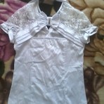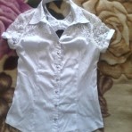 Блузка белая с гипюровыми вставками, сзади на спине вырез и бант, короткий рукав, разм.М, в отличном состоянии