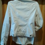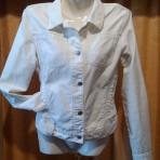 Белая джинсовая куртка. Плотный джинс – коттон (не стрейч). Замеры: в плечах – 40 см, ширина – 42 см, рукав – 62 см. Размер – 46. Состояние хорошее. Цена – 30 грн.