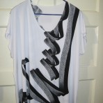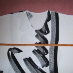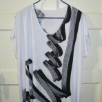 Красивая, легкая, блуза в бело-серых тонах. Фасон классический. За счет структуры ткани, она не топорщится, а как бы струится и приятно «холодит» к телу. Рисунок позволяет срыть проблемные места, а блуза прекрасно смотрится с любым типом брюк, в т.ч. джинс. Под юбку не носила, не скажу, но мое личное мнение, что под брюки будет лучше, потому как блуза носится поверх, а это возможно далеко не под каждую юбку. Она удлиненная (на мой рост прикрывает попу) потому скрывает лишние складки в области живота и бедер. При этом не полнит, не смотря на то, что большой размер и в принципе основной цвет – белый. На блузке присутствуют небольшие вкрапления стилизованные под камушки (см. фото). На солнышке красиво переливается, но при этом не слепит блеском «а-ля волочкова».