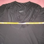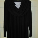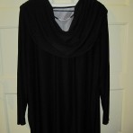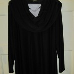 Чёрная, очень приятная к телу кофта из струящейся ткани. Фото не передает в достаточной мере ее фасон, потому если кратко, то ворот пошит в форме широкого хомута и спадает волнами добавляя эффектности по сути простому фасону. На шее небольшая вставочка из сетки (качество вставки тоже не грубое, очень приятное к телу). Вставка не глубокая, выглядит сдержанно. Рукав длинный.