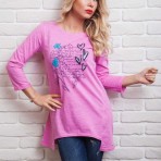 Эта легкая женская кофточка привлекает внимание в первую очередь своим оригинальным фасоном. Рукава 3/4 внизу подвернуты и пристрочены на наружную сторону, вырез горловины круглый, бока удлиненные за счет клинообразных вставок с прямым низом. Передняя полка украшена цветочным принтом с надписями и сердечками (сердца дополнительно декорированы блестками). Боковые вставочки внизу дополнены серебристыми полубусинами.
