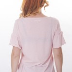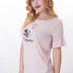 Детали: женская футболка розовая с принтом спереди и надписью "Fragrance", рукава воланы.