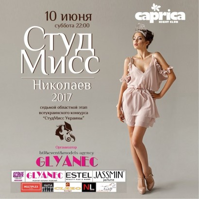 10 июня, суббота; НК "Caprica"! Агентство "Glyanec" приглашает всех жителей Николаева поддержать очаровательных студенток в борьбе за титул "СтудМисс Николаев 2017", публикацию в журнале и 1500 грн на обучение в школе моделей, право представлять Николаев на всеукраинском конкурсе "СтудМисс Украины 2017".