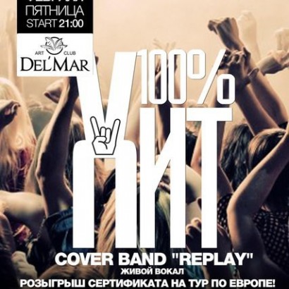 Рады Вам представить по-настоящему НОВЫЙ формат пятничной вечеринки от арт-клуба "Del'Mar" - "100%- ый ХИТ"! Все самые новые хиты, что ты слышал за последнее время! Наши НОВЫЕ резиденты cover band "REPLAY" исполнят для Вас только лучшие и любимые Вами хиты! Наш адрес: проспект Мира, 34.