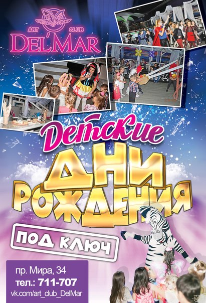 В жизни каждого ребенка нет более важного и приятного праздника чем День рождения. Мы предлагаем отметить Вам детский день рождения в art club Del'Mar. Сделайте себе и ребенку незабываемый праздник!!!