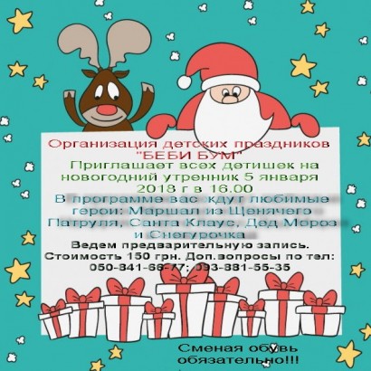 5 Января в 16.00 состоится новогодний утренник для всех детишек в праздничном зале Беби Бум. В программе вас ждут герои Маршал из Щенячего Патруля, Санта Клаус, Снегурочка и Дед Мороз.
