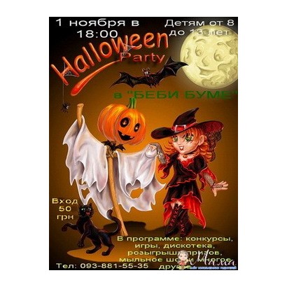 Уважаемые друзья! Приглашаем Вас на самую отпадную, веселую и зажигательную вечеринку в стиле Хэллоуин! Только 1 ноября в 18.00 для детей от 8 до 13 лет в детском центре "БЕБИ БУМ"! Вас встретят очаровательные Ведьмочки, злой Чертенок, настоящие Привидения, ходячая Тыквочка!