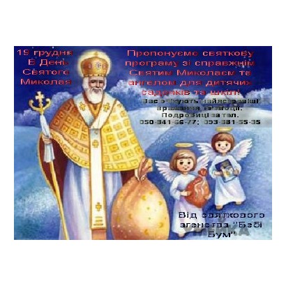 Праздничное Агенство " Беби Бум" приглашает всех деток вместе с родителями 19 декабря в 12.00 на игровую программу с настоящим Святым Николаем и Ангелом в магазин игрушек "Страна Чудес", который находится по адресу: пр.Ленина 116/2. Вход свободный. Подробности по тел 050- 841-66-77; 093-881-55-35