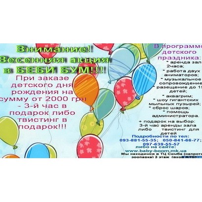 Весенняя акция в БЕБИ БУМ! При заказе детского праздника на сумму от 2000 грн - третий час в подарок либо твистинг в подарок!