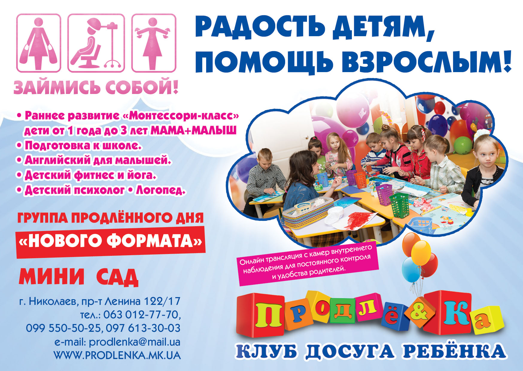 Клуб досуга ребенка «Продленка» организован для отдыха и досуга детей от 1 года до 11 лет. У нас в клубе Ваш ребенок сможет выбрать для себя интересное и любимое занятие. А мы поможем ему раскрыть в себе новые таланты и выбрать то, что увлечет его.