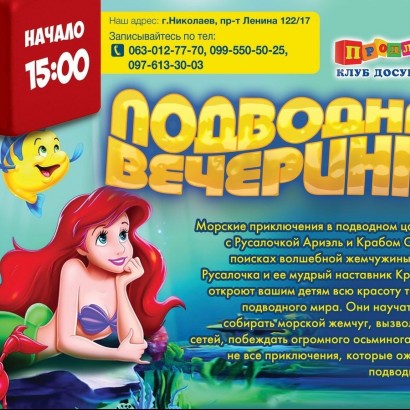 Морские приключения в подводном царстве вместе с Русалочкой Ариэль и Крабом Себастьяном в поисках волшебной жемчужины. Прекрасная Русалочка и ее мудрый наставник Краб Себастьян откроют вашим детям всю красоту таинственного подводного мира. Они научат ваших детей собирать морской жемчуг, вызволять рыбок из сетей, побеждать огромного осьминога и это далеко не все приключения, которые ожидают гостей подводного царства.