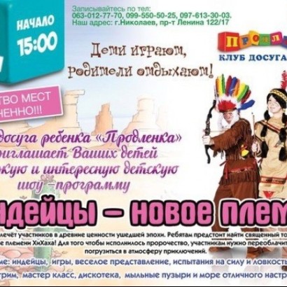 Клуб досуга ребёнка "Продлёнка" приглашает Ваших детей на яркую и интересную детскую шоу-программу, которая вовлечёт участников в древние ценности ушедшей эпохи. Ребятам предстоит найти священный тотем и обрести великое счастье племени ХиХаха! Для того, чтобы исполнилось пророчество, участникам нужно переоблачиться в индейцев и погрузиться в атмосферу приключений.