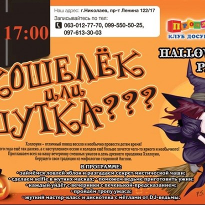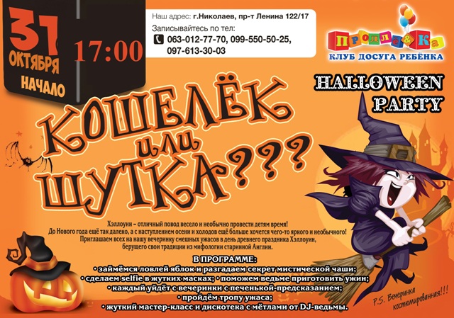 31 октября 2017 начало в 17-00 "HALLOWEEN PARTY" в ПРОДЛЁНКЕ!!! В гостях Очаровательная Ведьма-Паучиха и Загадочный Мистер Мумия!!! В ПРОГРАММЕ: -Вас ждёт магическое ХИМИЧЕСКОЕ ШОУ от Сумашедшего Профессора! -ОГРОМНАЯ ПИНЬЯТА-ТЫКВА с СЮРПРИЗАМИ и ПРЕДСКАЗ