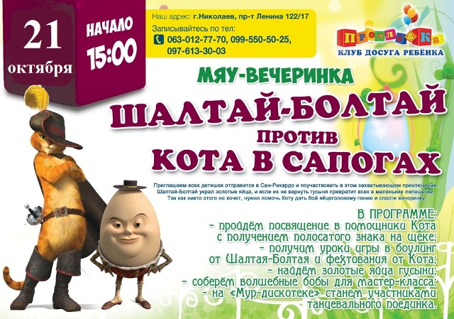 0 комментариев “МЯУ-ВЕЧЕРИНКА "ШАЛТАЙ БОЛТАЙ против КОТА В САПОГАХ"!!!”
