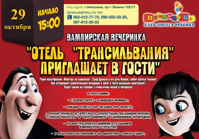 0 комментариев “ВАМПИРСКАЯ ВЕЧЕРИНКА "ОТЕЛЬ "ТЕРАНСИЛЬВАНИЯ" ПРИГЛАШАЕТ В ГОСТИ"!!!”
