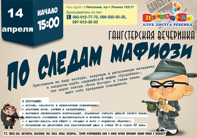 В СУББОТУ 14 АПРЕЛЯ!!! НА 15:00!! Приглашаем всех на ГАНГСТЕРСКУЮ ВЕЧЕРИНКУ "ПО СЛЕДАМ МАФИОЗИ"!