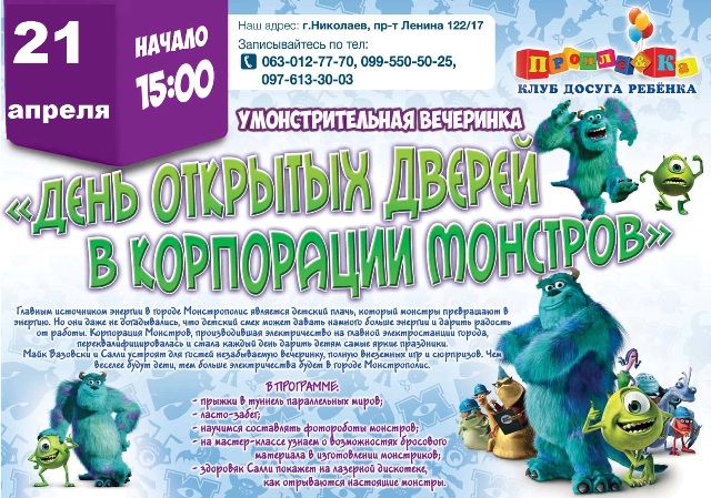 21 АПРЕЛЯ!!! В 15:00!!! Приглашаем всех деток на умонстрительную вечеринку "ДЕНЬ ОТКРЫТЫХ ДВЕРЕЙ В КОРПОРАЦИИ МОНСТРОВ"!!!