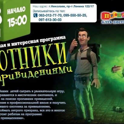 Клуб досуга ребенка «Продленка» приглашает детей на динамичную и интересную программу «Охотники за привидениями» и сыграть в увлекательную игру, где они, превращаются в мистических охотников, и отправляются на поиски пропавших привидений. Пройти обучение в профессиональной школе и получить диплом настоящего охотника за привидениями, выследить и поймать хитрого призрака, все это и многое другое предстоит ребятам на программе «Охотники за привидениями»