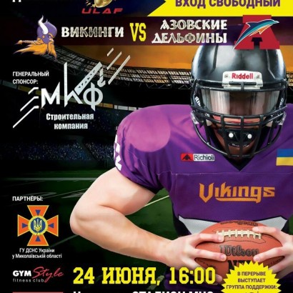 Дорогие друзья, любители и ценители настоящего футбола, приглашаем Вас на матч в рамках всеукраинского Чемпионата ULAF между николаевскими «Викингами» и мариупольскими «Азовскими Дельфинами»