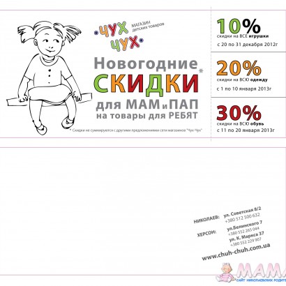 2. Взять флаер и прийти в гости в любой из магазинов «Чух-Чух» в акционные даты, которые обозначены в нем. Посетить нас можно и в любое другое время, мы вам очень будем рады =)