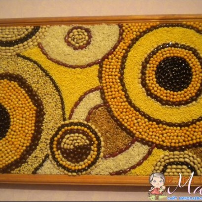 Крупа — прекрасный материал для поделок. Ее легко можно покрасить, и тем самым сделать работу яркой и привлекательной. Гречка, пшено, манка, рис, горох, различные семечки все, что только можно наклеить пригодится для работы. Картины из круп — красивое и оригинальное украшение вашего дома.