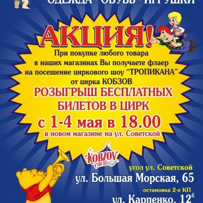При покупке любого товара в магазинах сети "Дитячий простір" получи флаер на посещение циркового шоу "Тропикана" от цирка Кобзов.