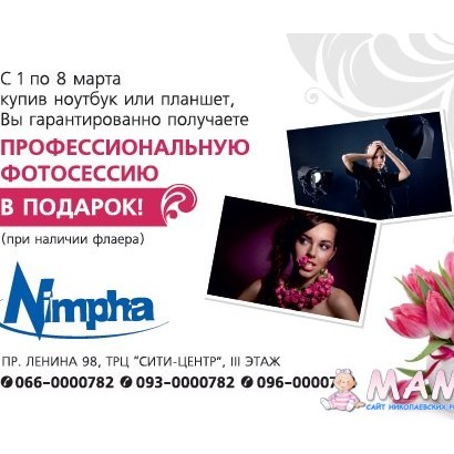 Каждая девушка и женщина хочет выглядеть на все 100! С профессиональным фотографом Вы сможете запечатлеть себя в новом ракурсе и порадовать себя и близких новыми качественными фотографиями. Поэтому магазин "Nimpha", специально к 8 марта, подготовил сюрприз для прекрасного женского пола: ФОТОСЕССИЮ В ПОДАРОК ОТ НИНЫ ЧЕПКАСОВОЙ http://vk.com/nch_group C 1 по 8 марта купив ноутбук или планшет в нашем магазине и при наличии флаера Вы гарантированно получаете профессиональную фотосессию в подарок! Внимание! Флаера для фотосессии Вы можете получить 6,7 марта после 17.00 у входа в "Сити-Центр" либо в магазине Nimpha на третьем этаже ТРЦ "Сити-Центр".