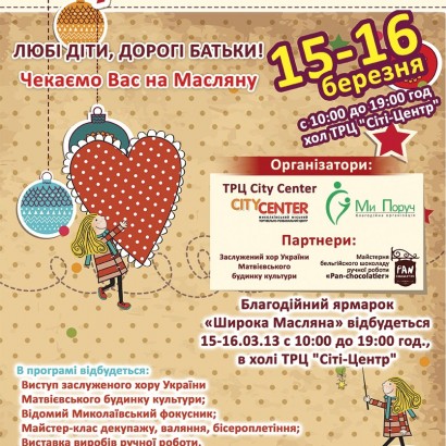 Добро пожаловать на Благотворительную ярмарку "Шировая МасленницА" в ТРЦ «СитиЦентр» 15,16 марта 2013. Николаевская Областная Благотворительная Организация "Ми Поруч" совместно ТРЦ «СитиЦентр», при поддержке мастеров рукодельников и «Мастерской бельгийского шоколада ручной работы «Pan-Chocolatier» приглашает принять участие гостей и жителей Николаева в благотворительной ярмарке «Широкая Масленница». В рамках проекта организовывается сбор средств, для детей больных ДЦП по методу Иппотерапия. На ярмарке будут представлены изделия ручной работы, изготовленные мастерами индустрии Хэнд-Мэйд г. Николаева. В программе детские конкурсы, выступление знаменитого фокусника - Вятчеслава, выступление Заслуженного хора Украины «Матвеевского ДК». Ярмарка состоится 15,16 марта 2013 года в холле Торгово-Развлекательного Центра Сити- Центр г. Николаев, пр Ленина 98. Время работы ярмарки: с 11.00 до 19.00 Вы сможете попробовать шоколад ручной работы по рецептам бельгийских мастеров, полакомится блинами от "Великой Кишені" с разными начинками, выбрать оригинальный подарки для своих друзей, и помочь деткам с ДЦП пройти курсы реабилитации с лошадками.