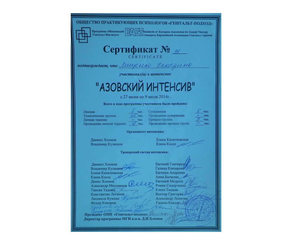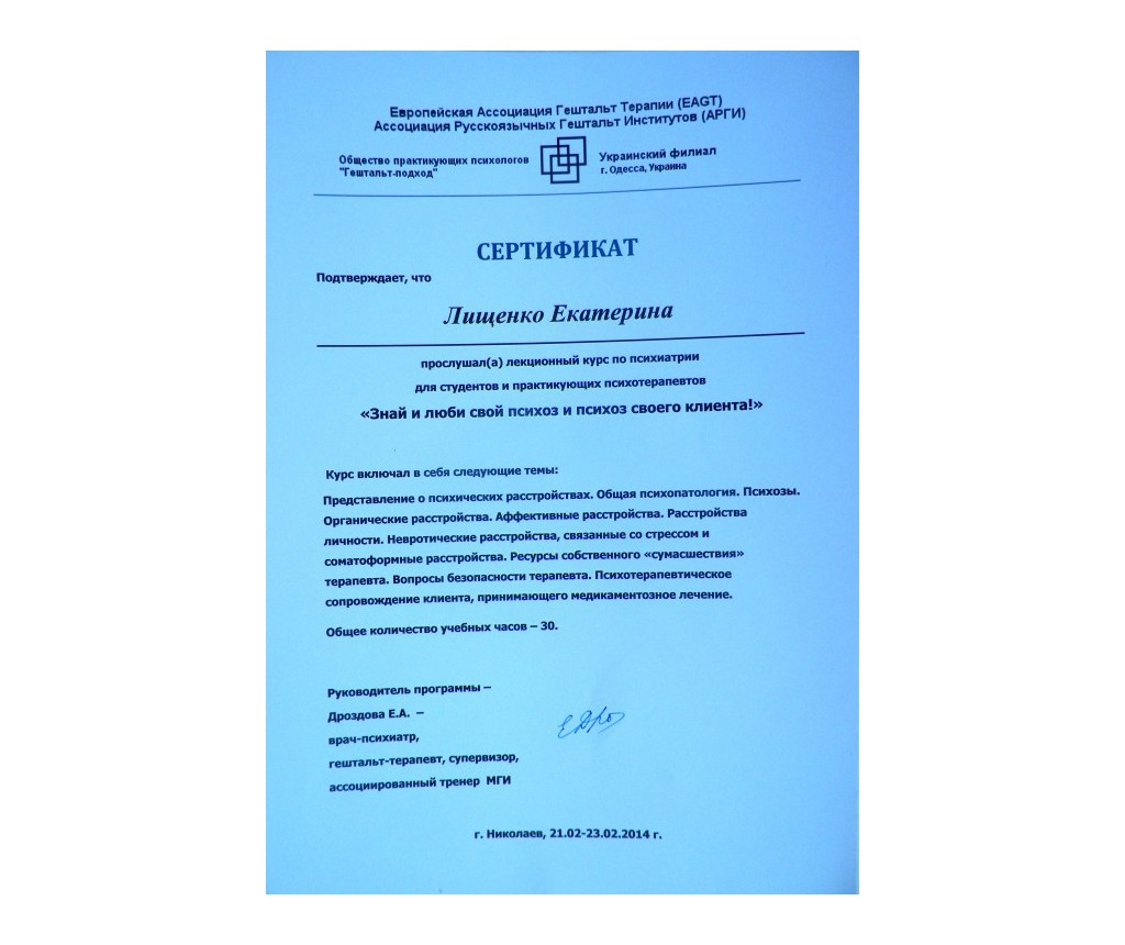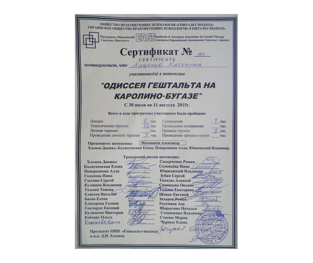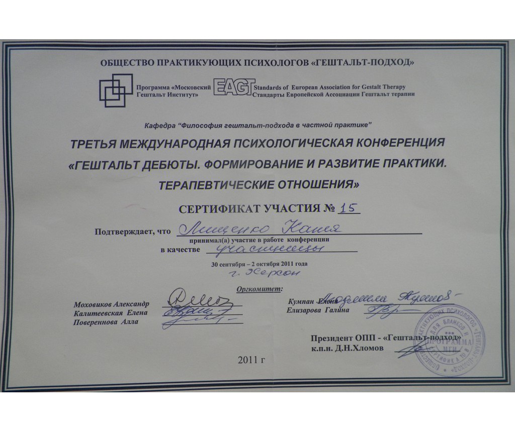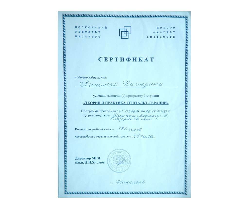 Психолог ,сертифицированный психотерапевт. Детский психолог Семейный психолог. Психолог в организациях. Коуч. Организатор фестиваля психологии «День чудес» г. Николаев. Ведущаяя терапевтических групп и треннингов.Сертификакт Европейской ассоциации гештальт-терапевтов. Магистрская работа по теме «Психотерапия с семьей»,специализация «Возрастные кризисы» ., «Работа с кризисами и травмами в условиях АТО»Практика с 2009 года.