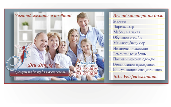 Услуги на дому для всей семьи! Мобильный салон Феи-Феникс, предоставит Вам парикмахерские услуги, маникюр/педикюр, массаж, татуаж, а так же услуги любого мастера на дом. Вас ждет волшебство преображения в уютной домашней обстановке, в удобное для Вас время. Ваши пожелания принимаем круглосуточно на сайте: http://fei-fenix.com.ua/; https://vk.com/uslugi_doma; http://ok.ru/group/57498773749801 тел: (073) 400 26 06; (068) 882 90 08