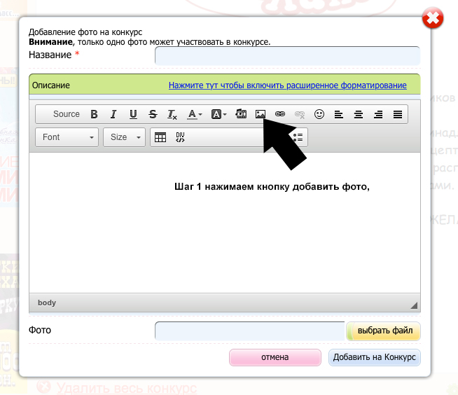 Если вы хотите добавить фотографии в вашу статью, новость либо конкурс, ниже приведены инструкции как это сделать